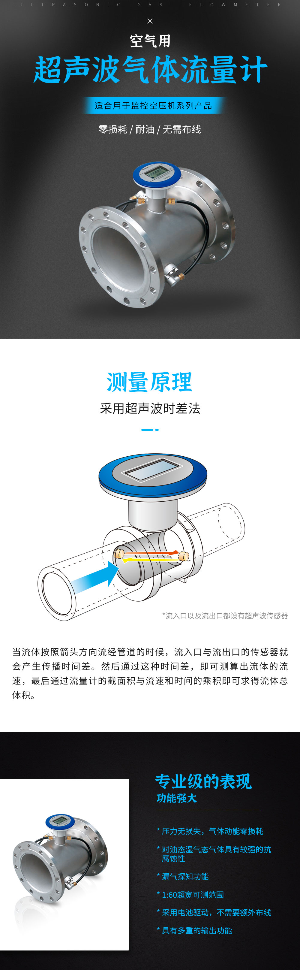 2.無節流件,無壓力損失,可對壓力不到1MPa的空氣進行流量測量。