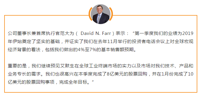 范大為表示:“全年訂單、基本銷售額、盈利能力和現金流均已步入正軌,旨在實現強勁增長的2019財年。在我們的每股收益預期內,我們在運營中納入了3美分運營上的并購費用,鑒于第一季度表現強于預期,將預期范圍提高了5美分。2019年我們將繼續有所作為,世界各地團隊已準備好為客戶和股東提供更高價值。”